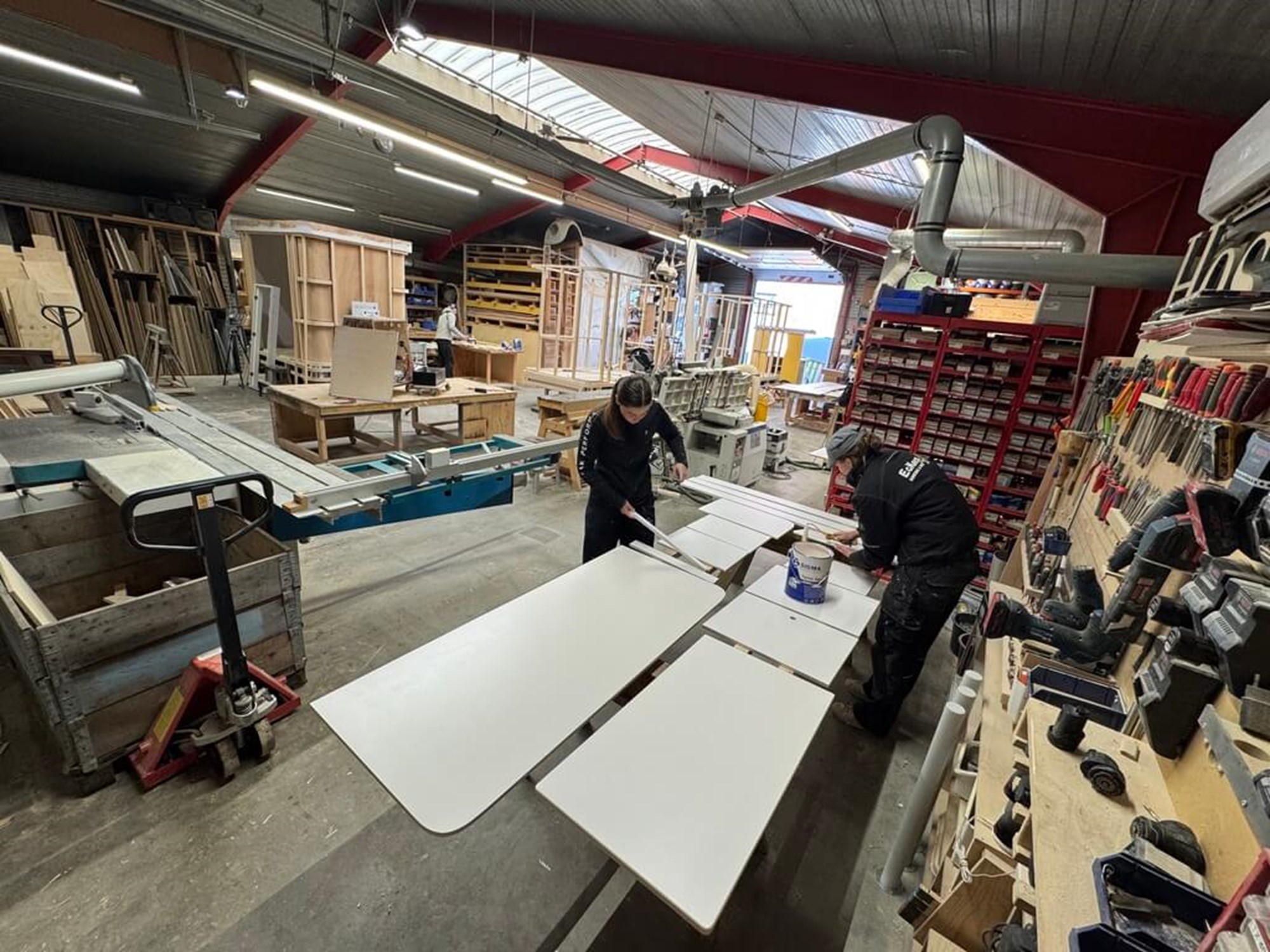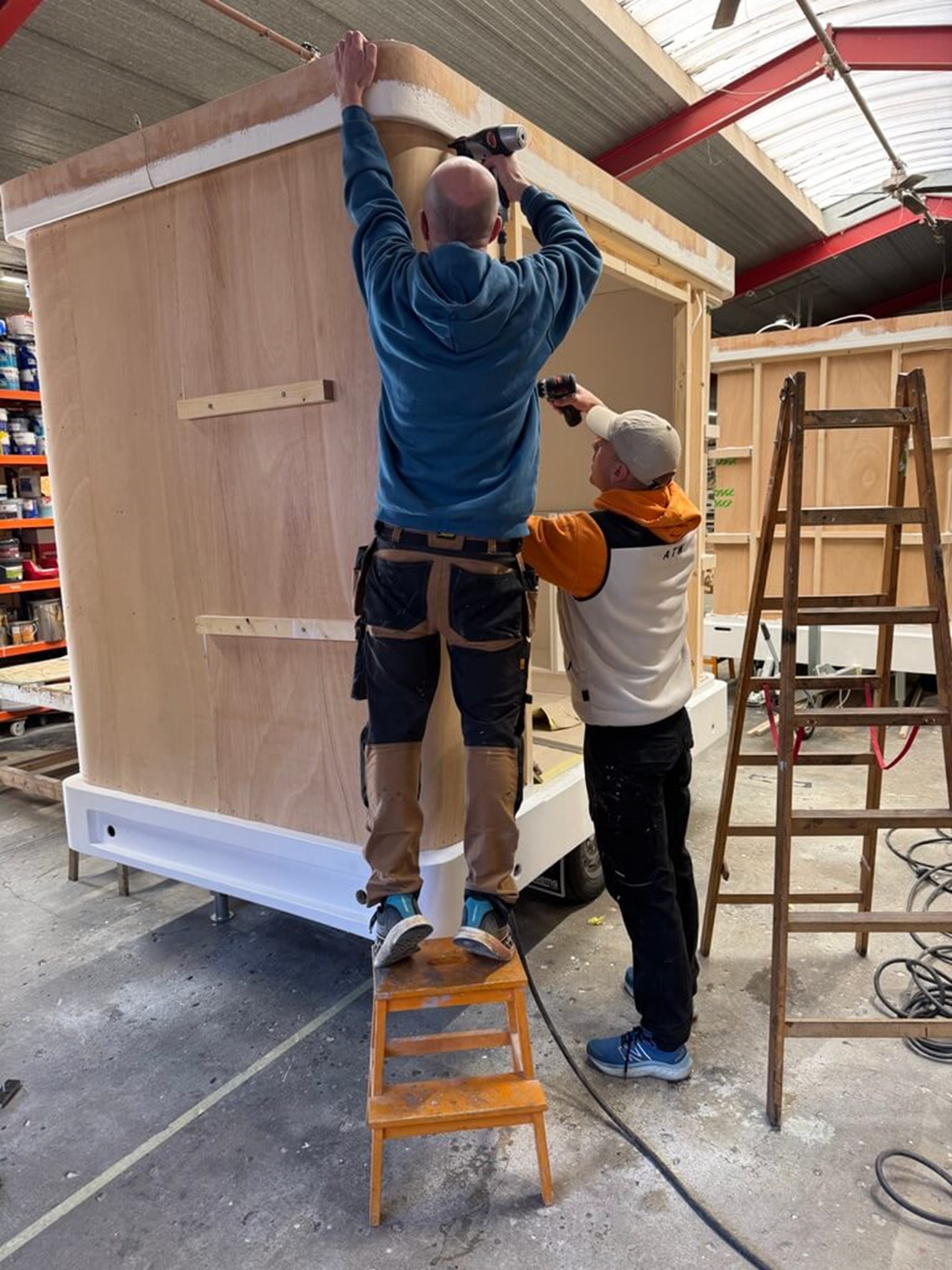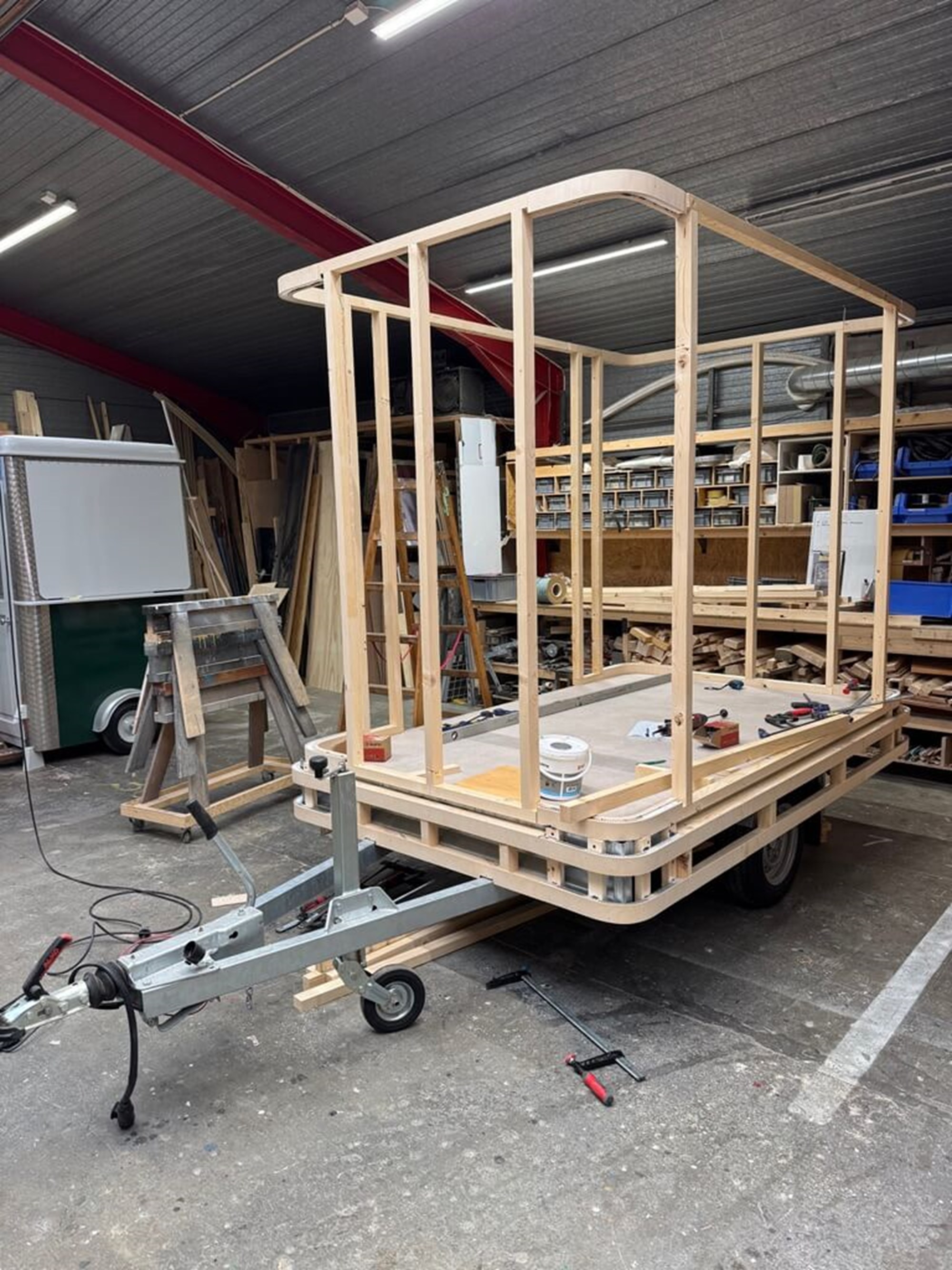 Med det udgangspunkt var det nærliggende at tage fat i det traditionelle klubhus som ikon – stedet, hvor vi mødes og udgangspunktet for sportslig udfoldelse. Et dansk klubhus er ikke prangende og er typisk bygget af frivillige kræfter. Tiny Office OK blev til et mobilt kontor / mobilt møderum i klassisk klubhusstil, som de ser ud rundt i landet. Vognen er udført i Superwood-træ og med genbrugt halgulv fra Bellevuehallen i Risskov. Pokaler pryder vinduet, og der er selvfølgelig plads til flere. Udvendig er der udsmykket med sportsredskaber, der samtidig fungerer som vindue og lægger op til kreative fotomuligheder. Der er altid plads på udskiftningsbænken. Indvendig er der siddepladser, køleskab og kaffemaskine. Hele vognen er isoleret, så den lille radiator kan holde klubhuset varmt hen over vinteren.