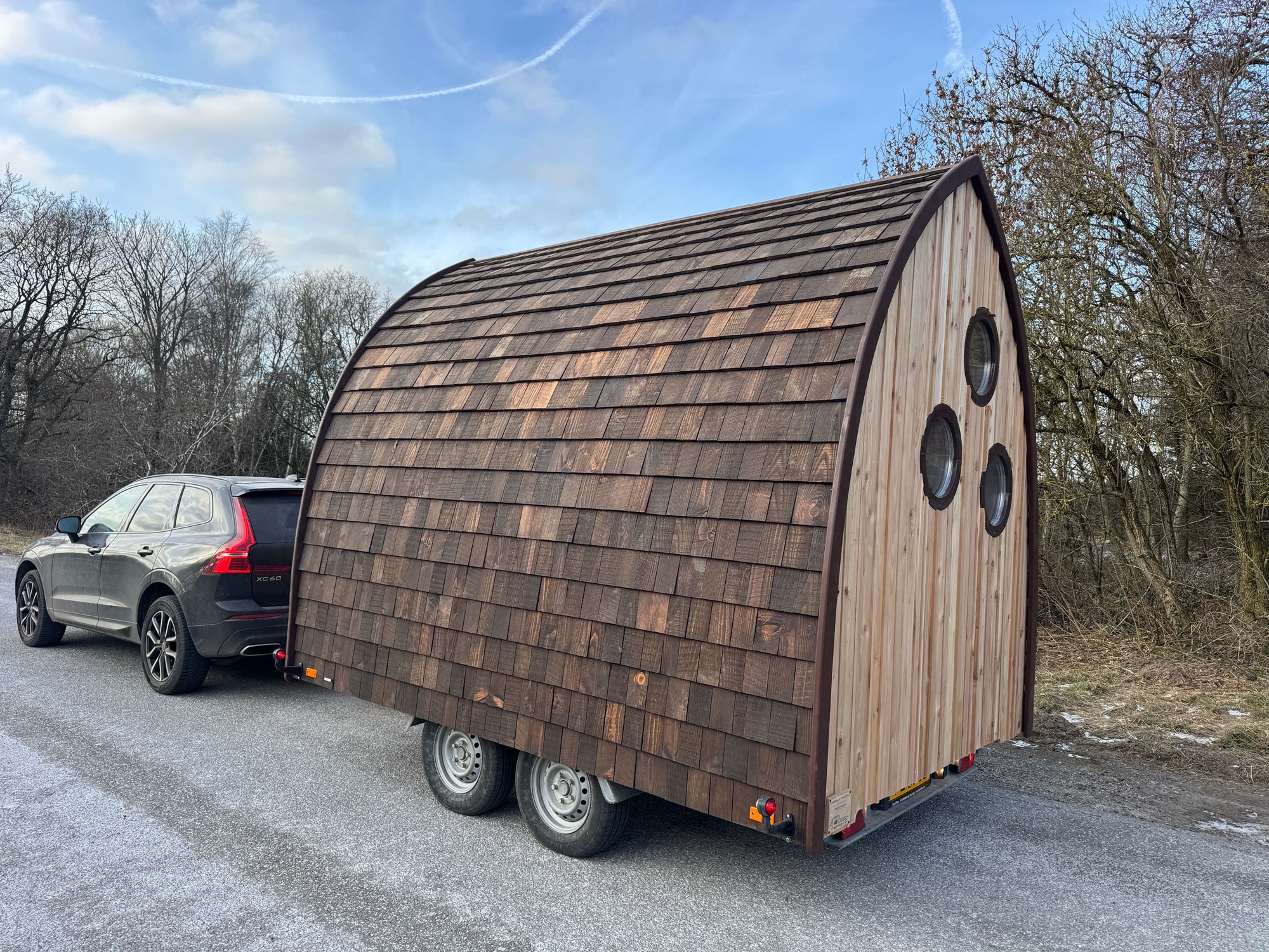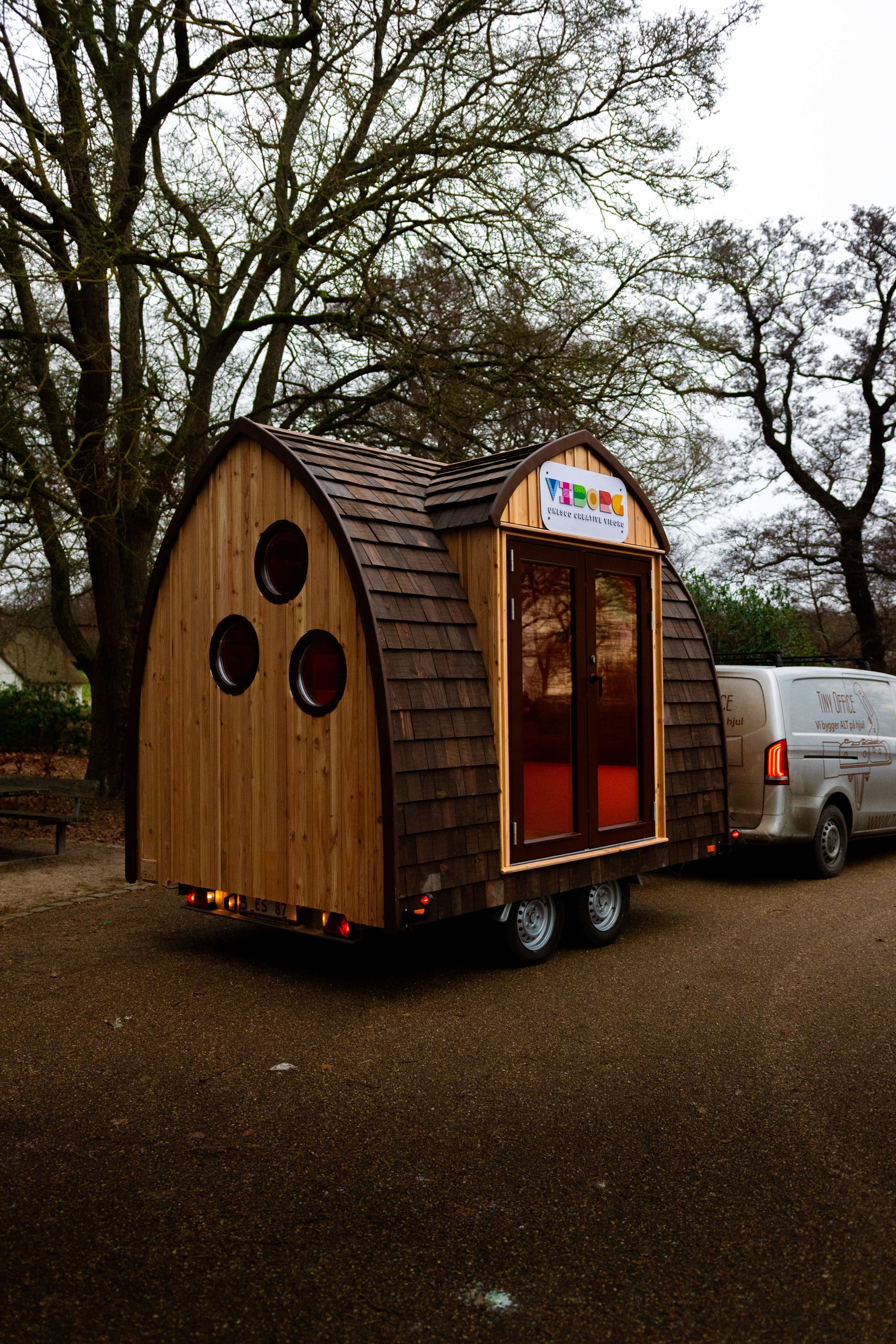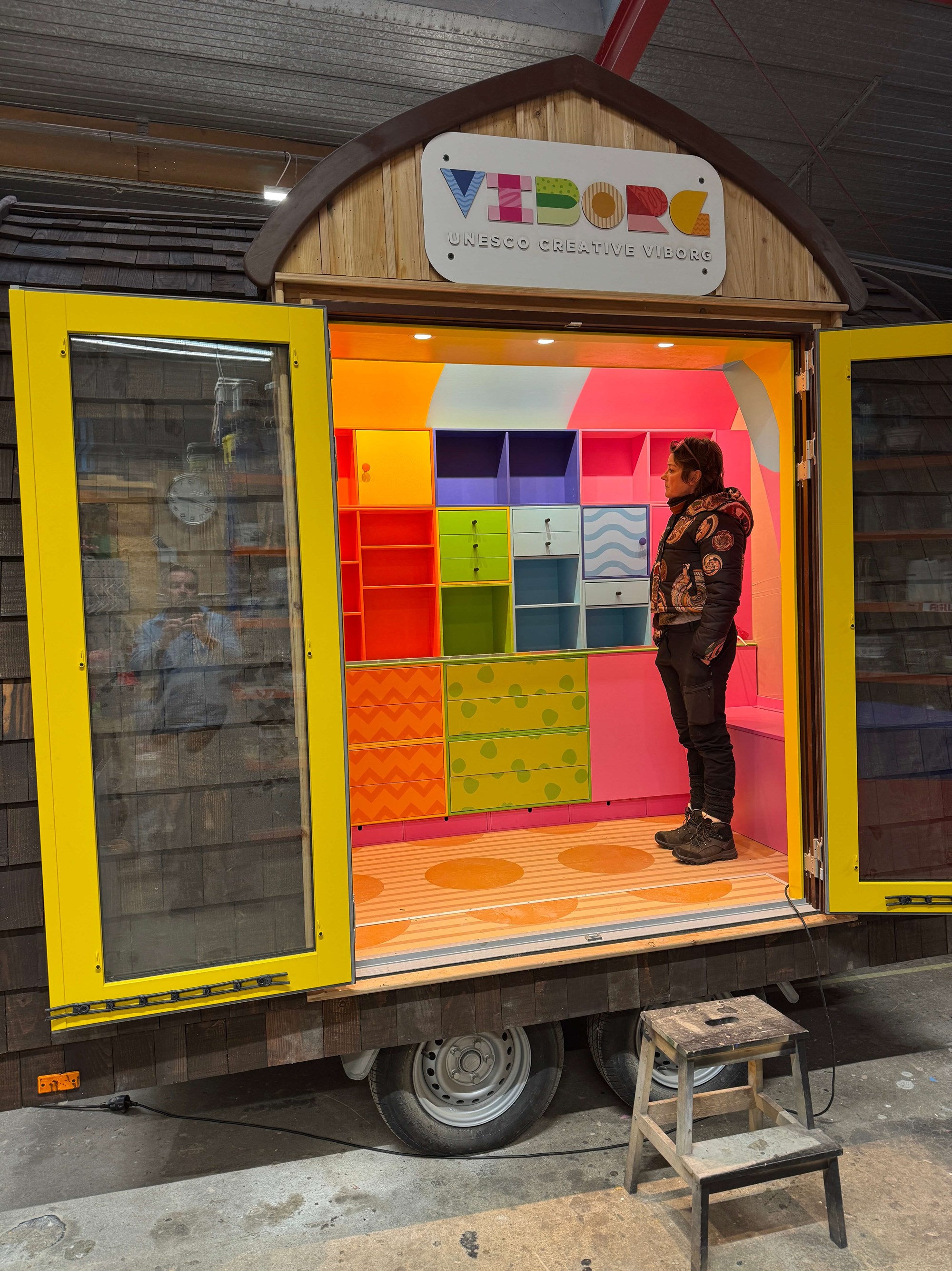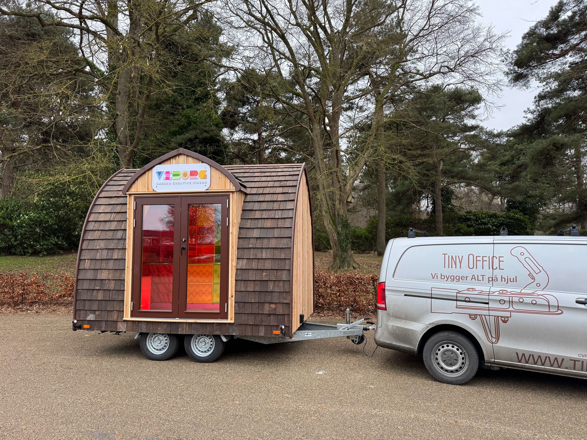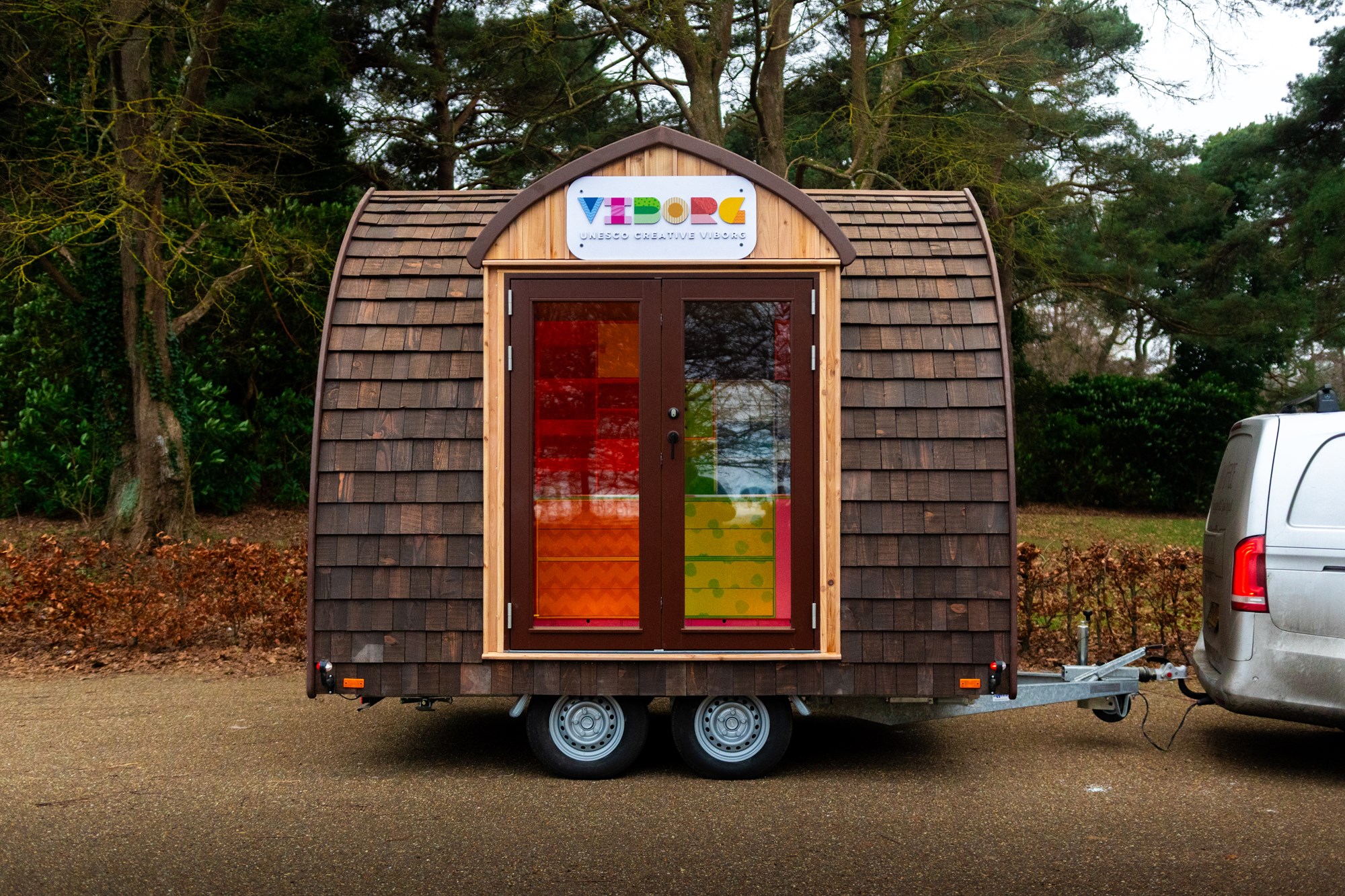 VIBORG er bygget af 2. sorterings SUPERWOOD og beklædt med træklinker behandlet med lindolie. Der er sat 3 runde vinduer i gavlen og dobbeltdøre på langsiden. De sekskantede trappepodier kan stables og opbevares i vognen under kørslen. Indvendig har vi tilpasset og malet inventar fra Trævarefabrikkerne.
