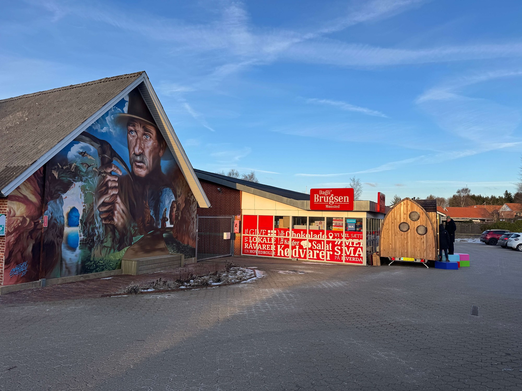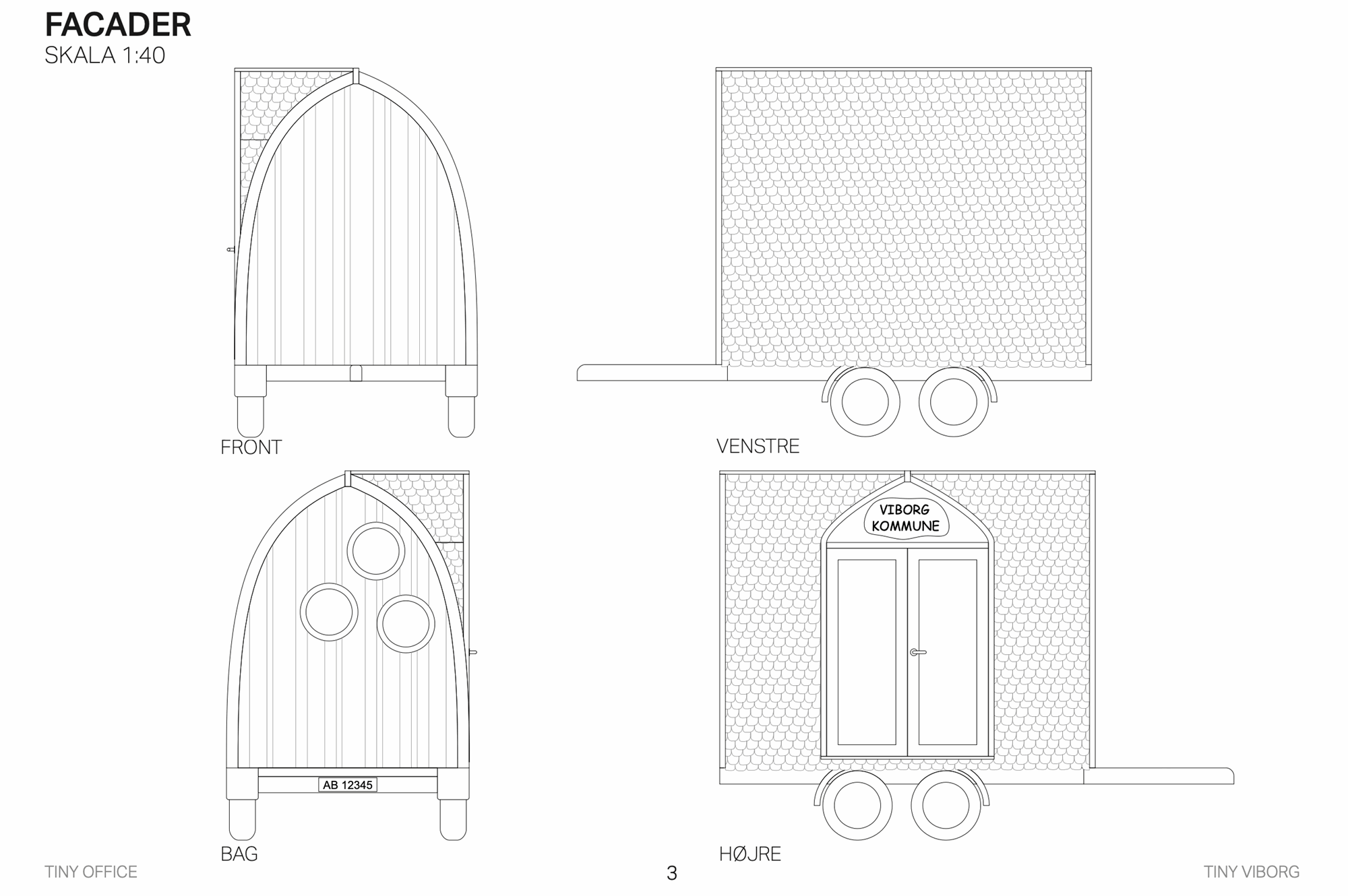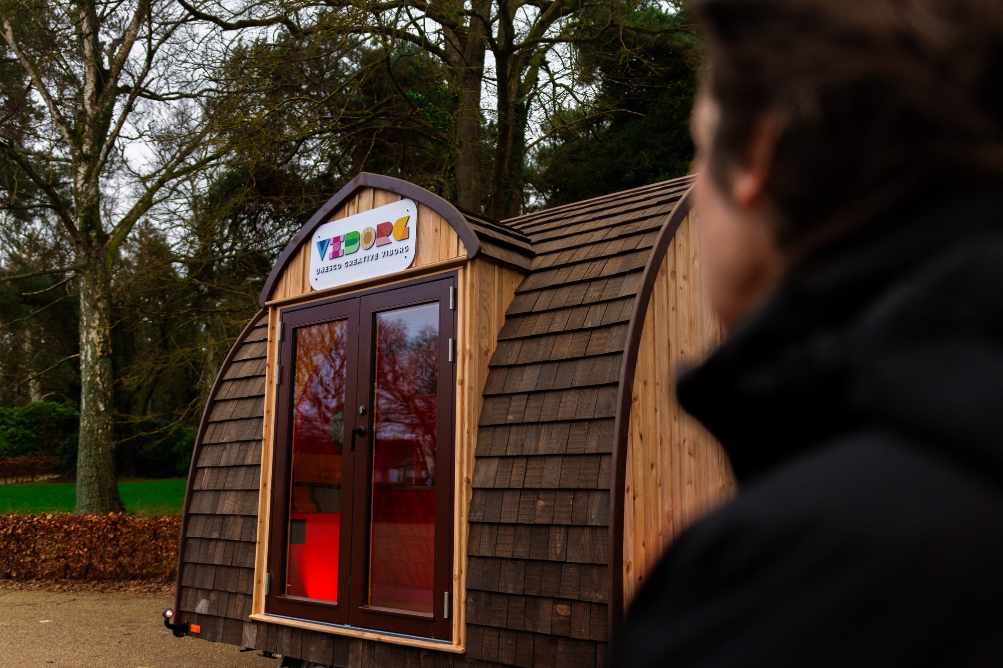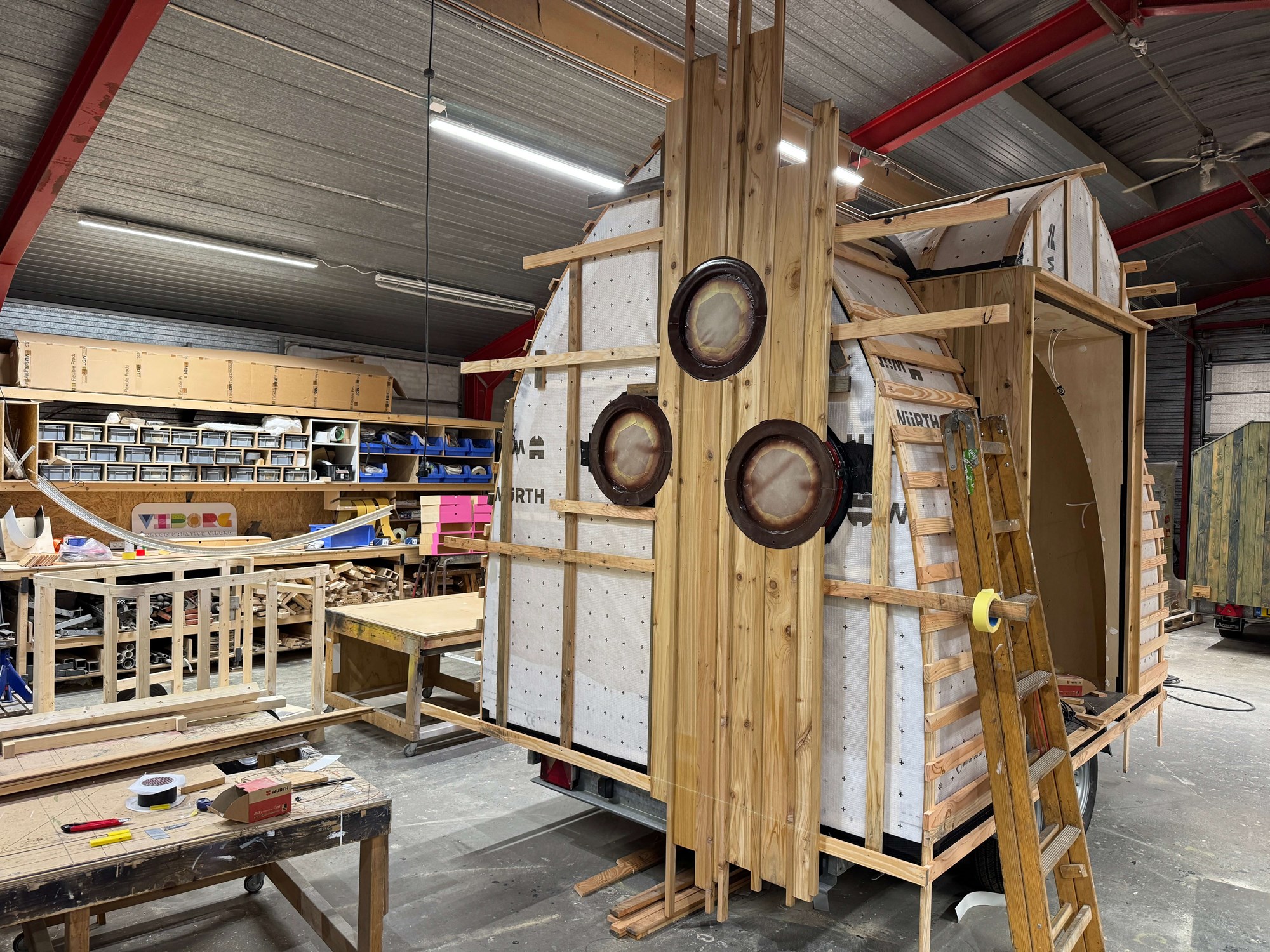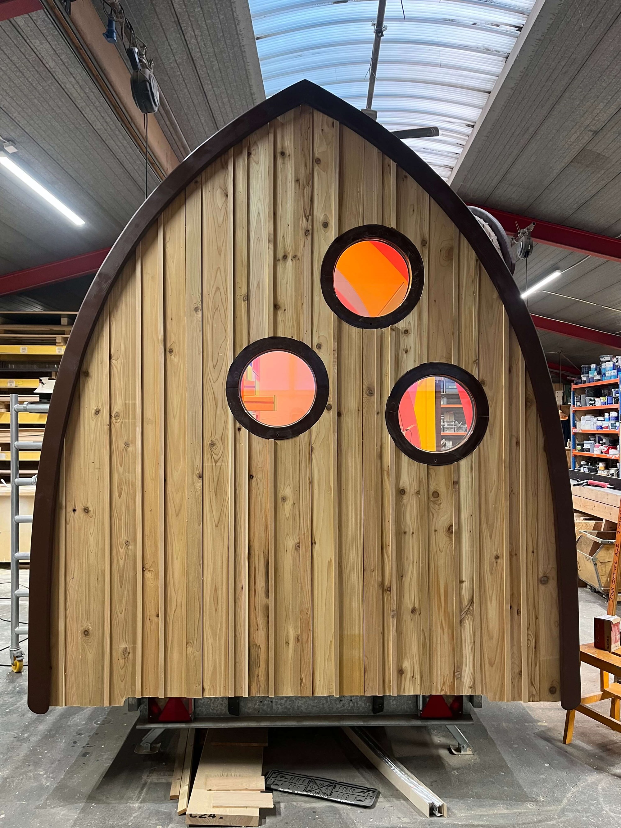 VIBORG er bygget af 2. sorterings SUPERWOOD og beklædt med træklinker behandlet med lindolie. Der er sat 3 runde vinduer i gavlen og dobbeltdøre på langsiden. De sekskantede trappepodier kan stables og opbevares i vognen under kørslen. Indvendig har vi tilpasset og malet inventar fra Trævarefabrikkerne.