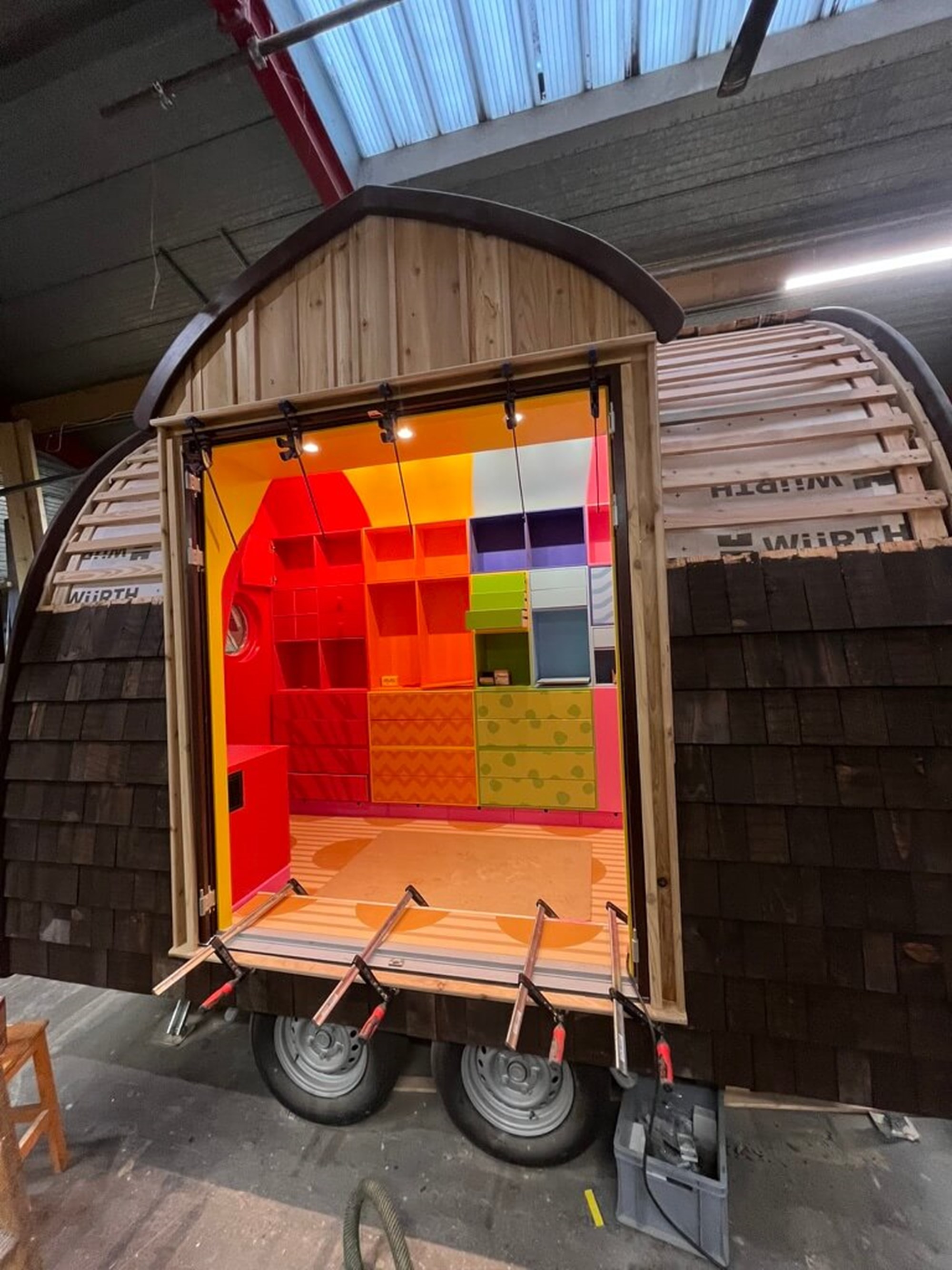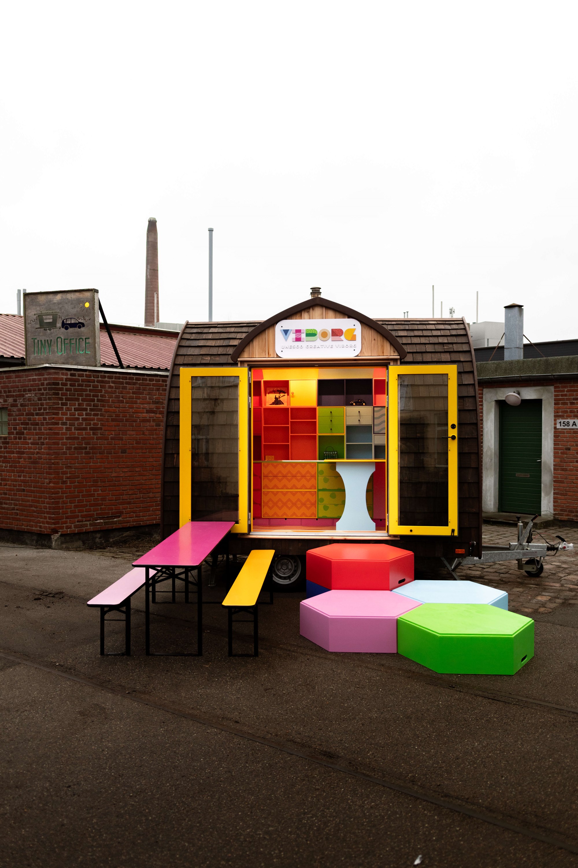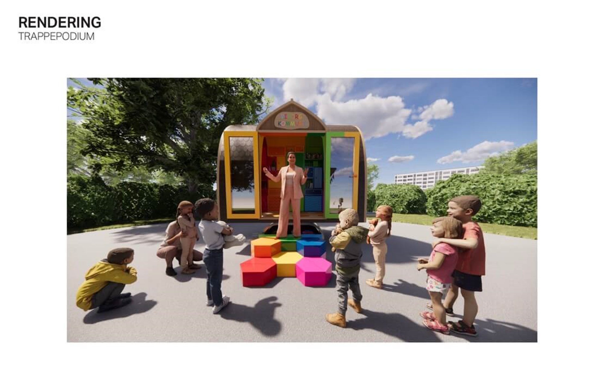 Når dørene åbner, lukkes der op for alle regnbuens farver, som inviterer til leg og kreativitet, og som næsten ’spilder’ ud af vognen gennem de 6 kantede trappepodie elementer. Vi leverer desuden borde og bænke til et udemiljø, som hænger sammen med vognens farverige udtryk.