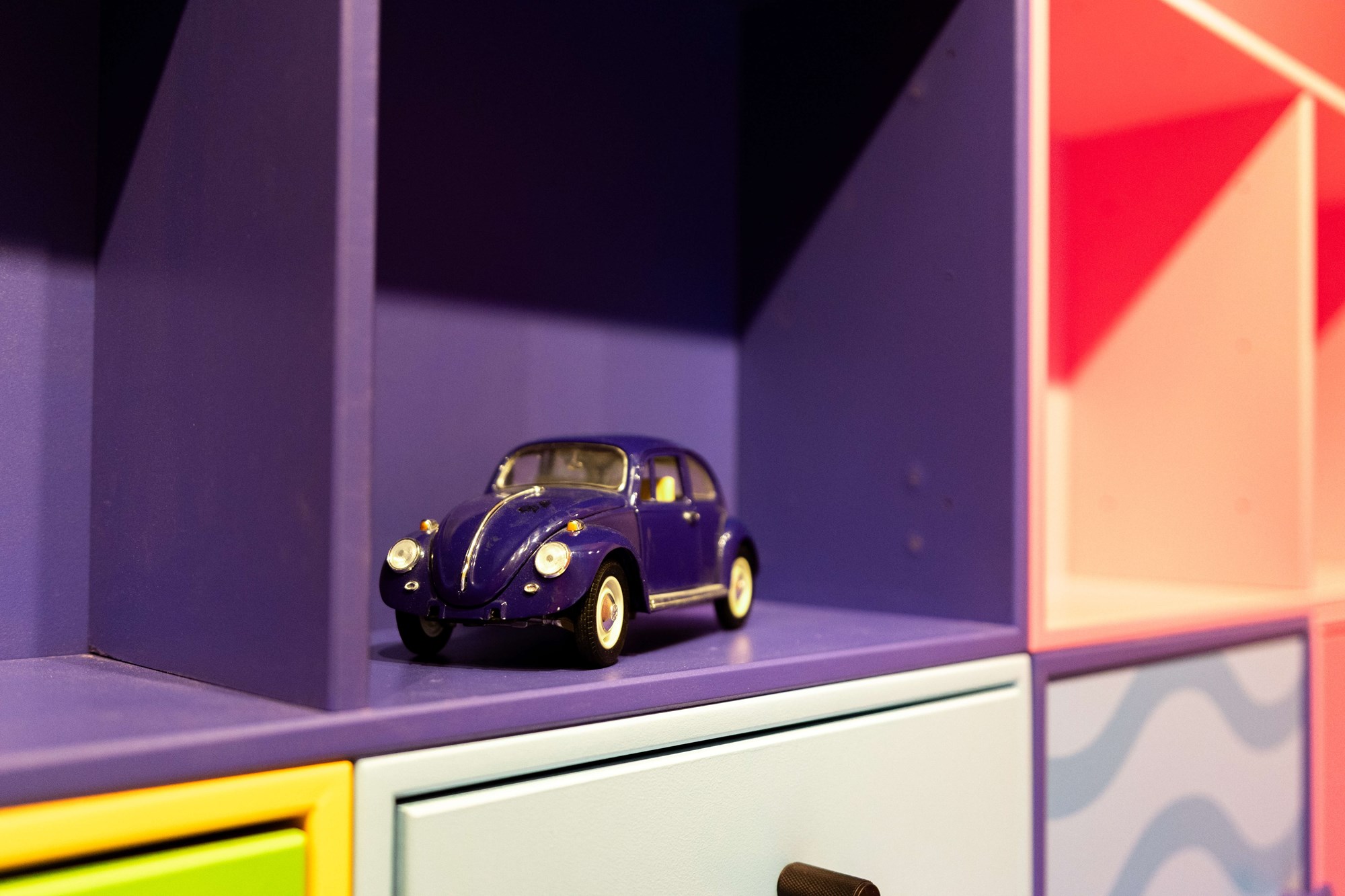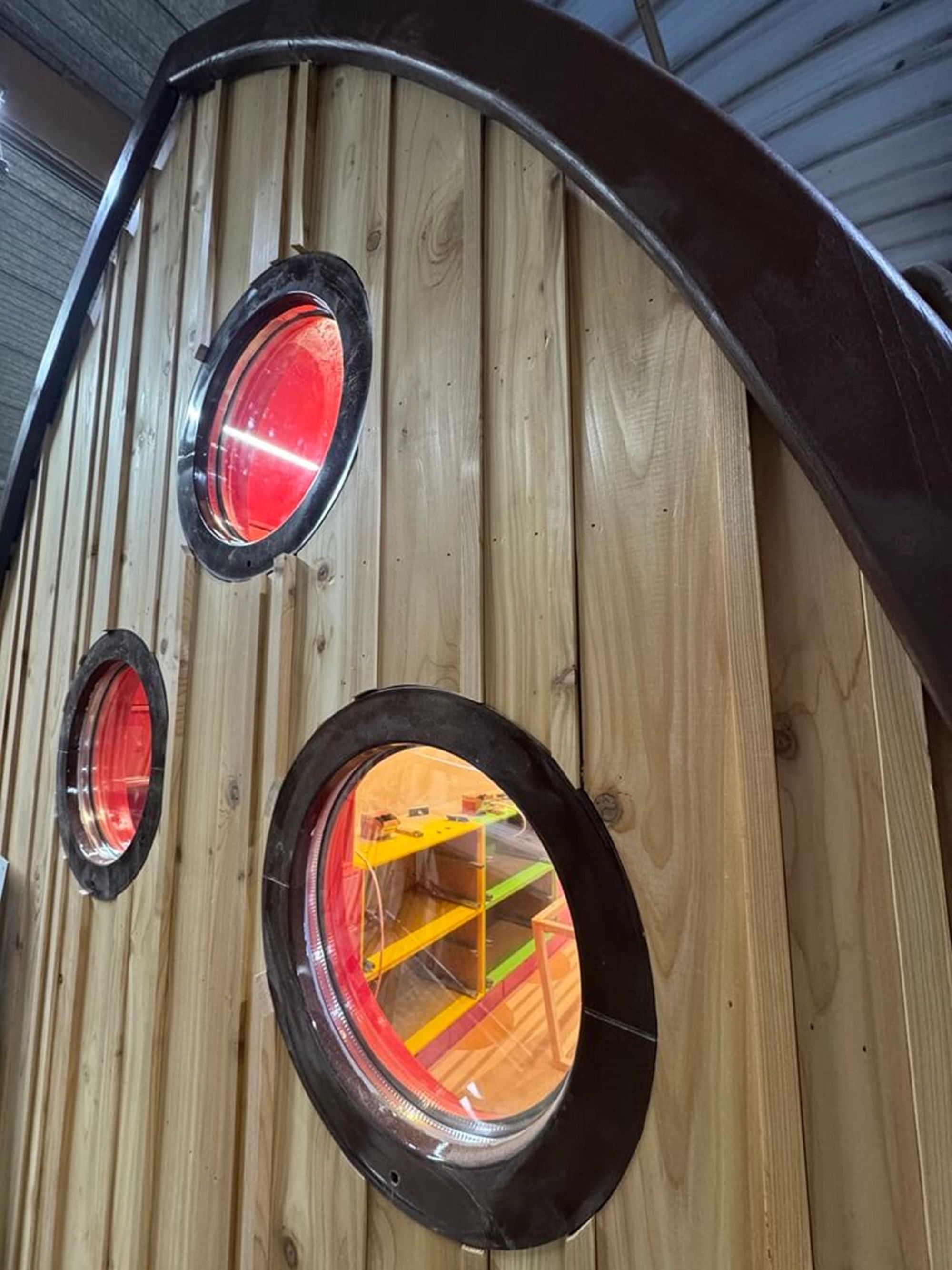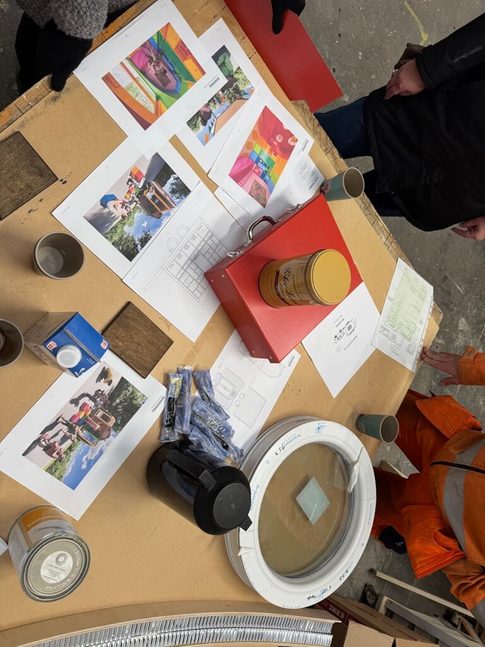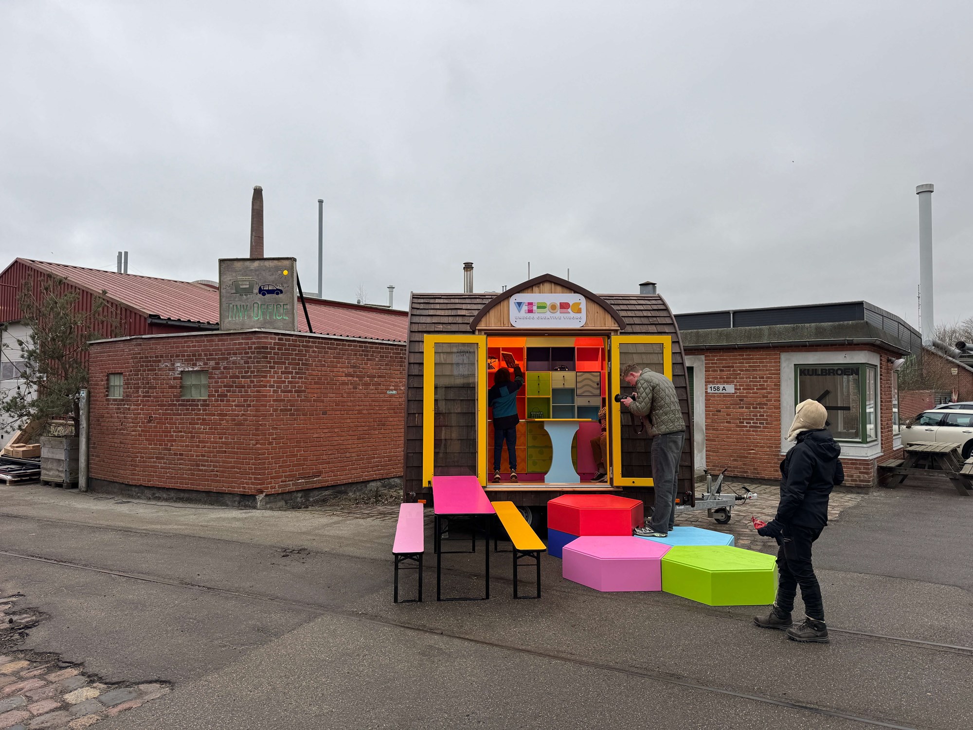 Når dørene åbner, lukkes der op for alle regnbuens farver, som inviterer til leg og kreativitet, og som næsten ’spilder’ ud af vognen gennem de 6 kantede trappepodie elementer. Vi leverer desuden borde og bænke til et udemiljø, som hænger sammen med vognens farverige udtryk.